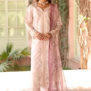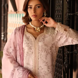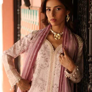 “Aruna” features a graceful front-open silhouette, adorned with intricate star stitch stippling in dreamy shades of soft pink and white. Delicate organza patches and a sleek border at the hem add a refined touch of detail. Paired with a printed chiffon dupatta, this ensemble exudes effortless elegance with a modern,