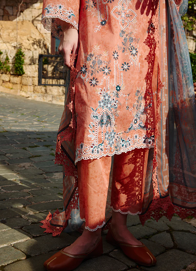 Amara in Coral Peach from our Spring Printkari ’25 Collection. A printed cutwork embroidered cotton 3-piece outfit paired with digital printed chiffon dupatta.