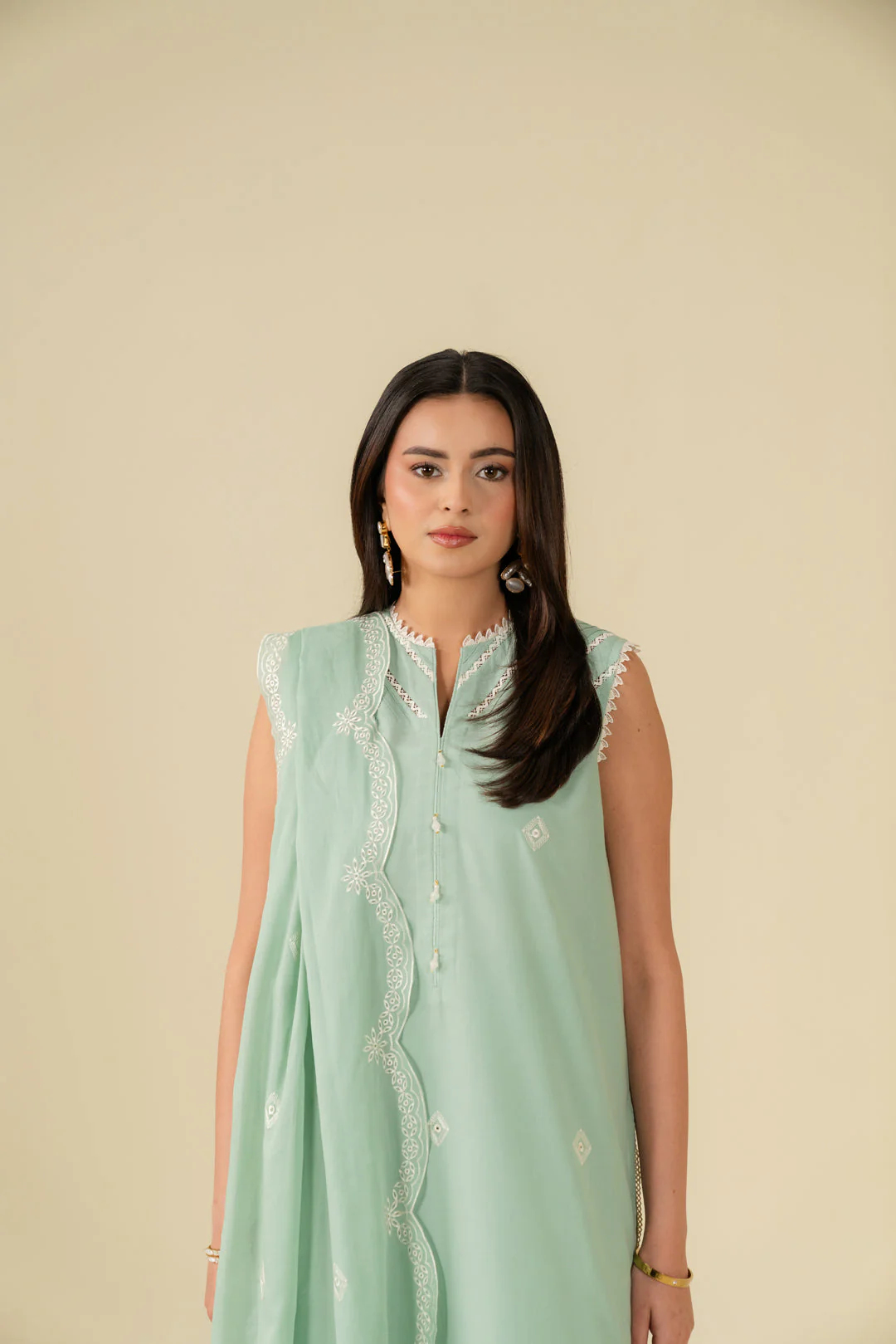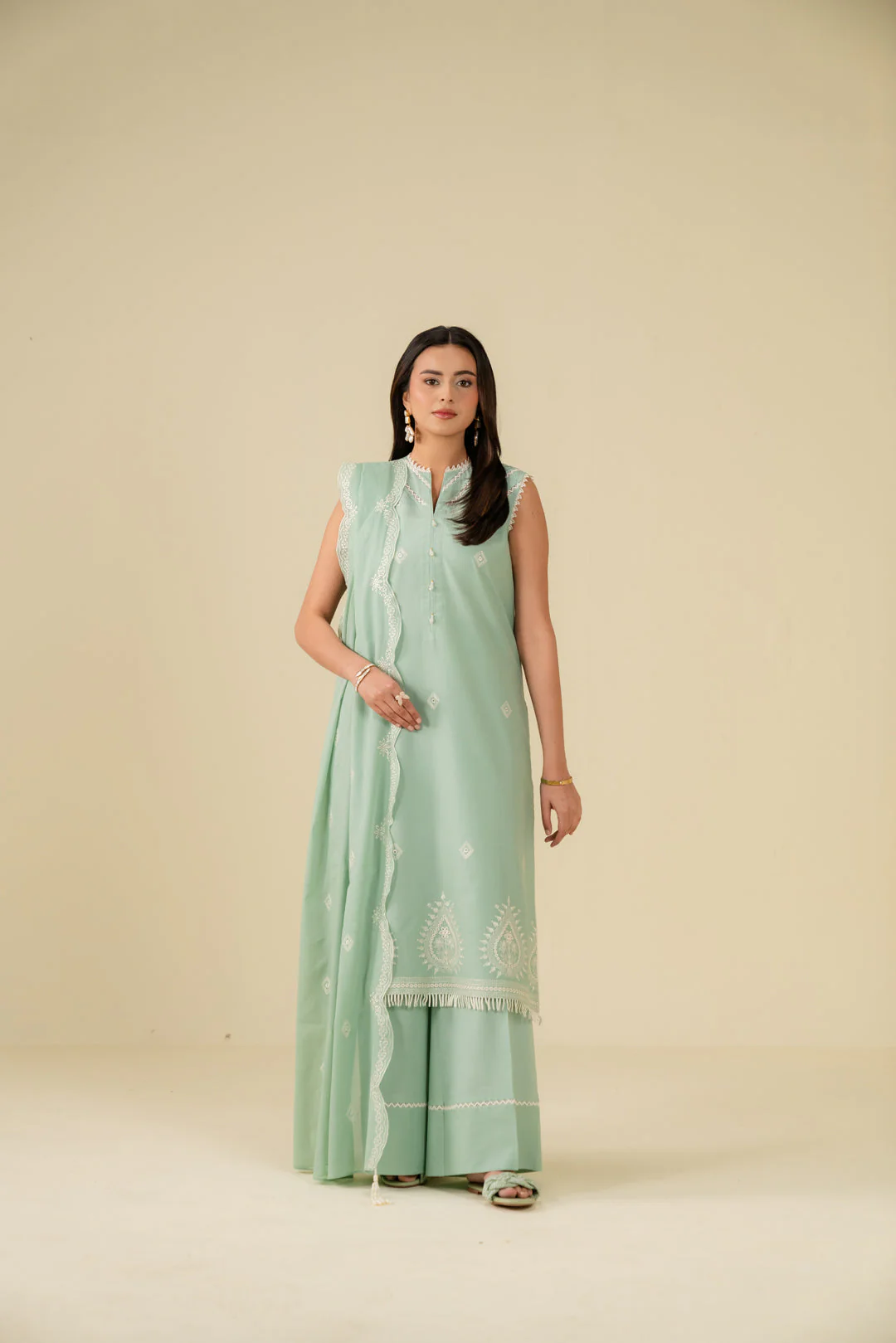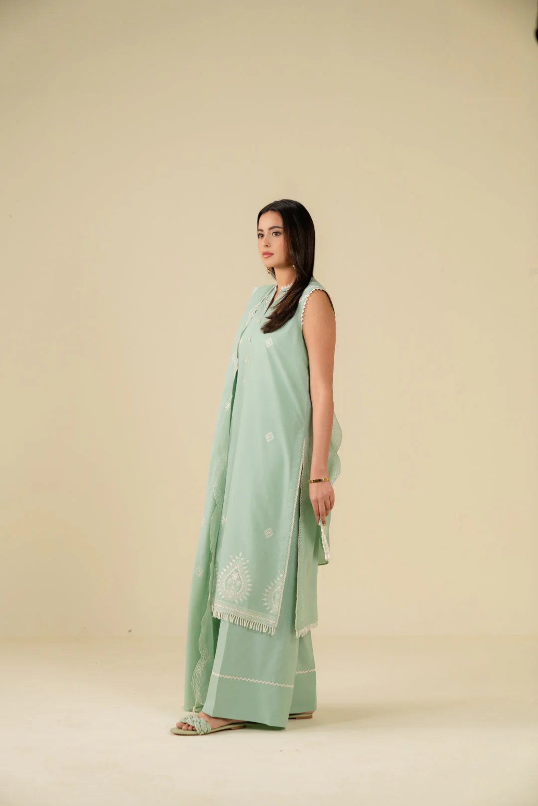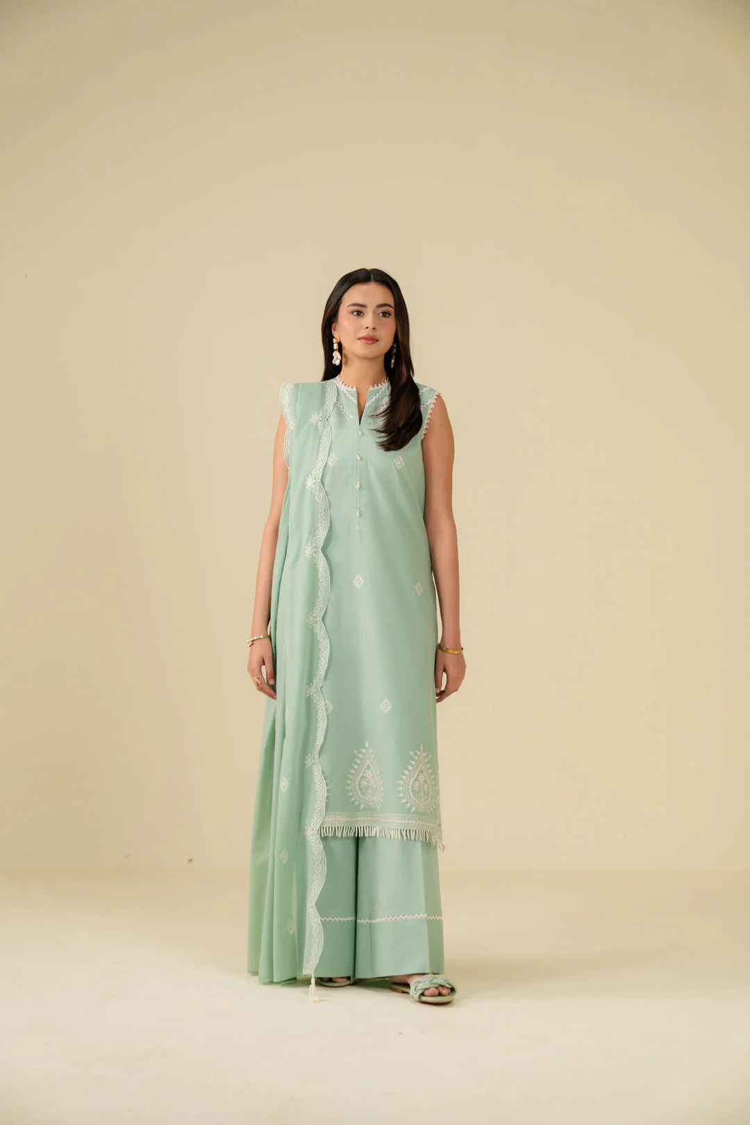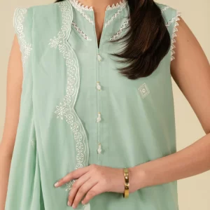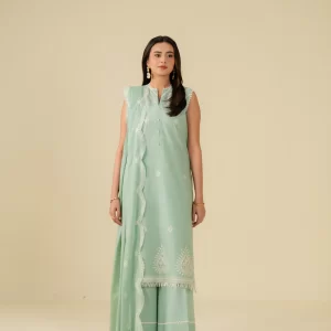 Light Green Embroidered Cotton Suit with Geometric Silk Dupatta