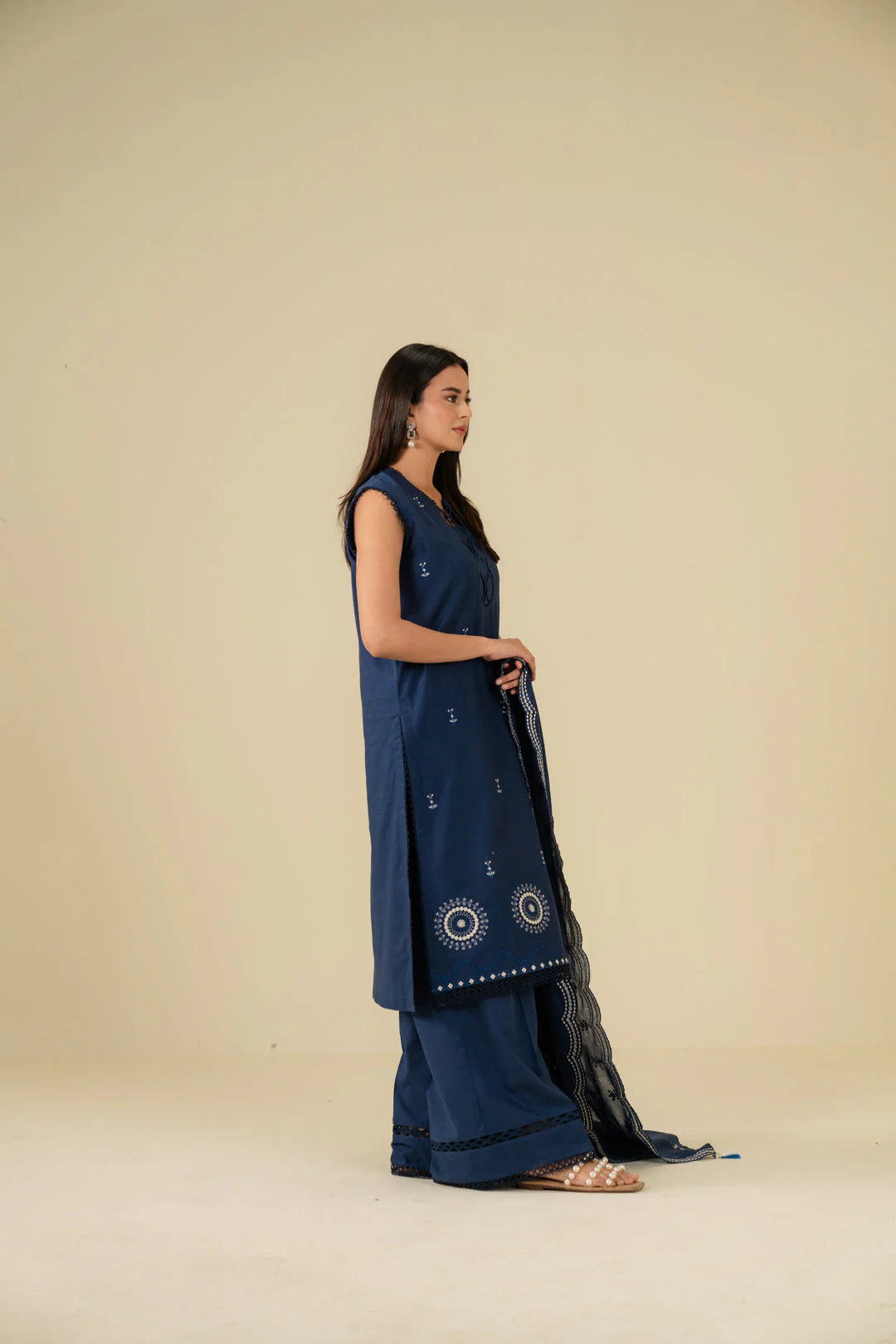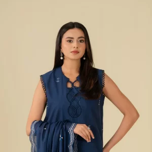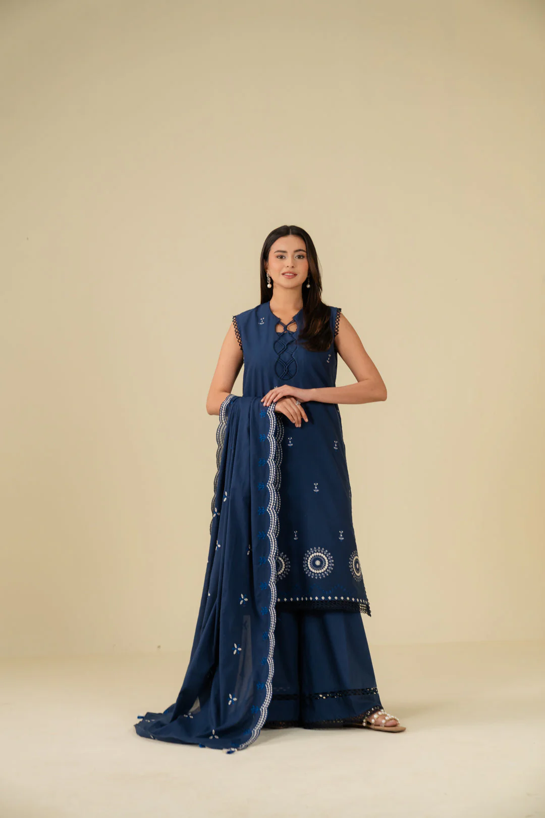 Elegant Navy Blue Embroidered Lawn Suit with Printed Chiffon Dupatta