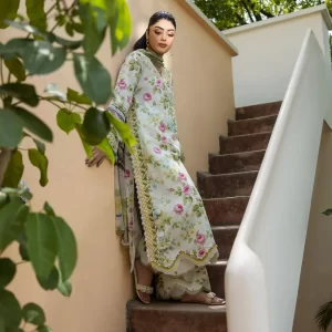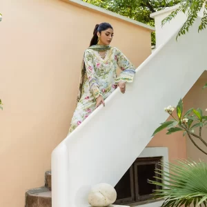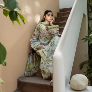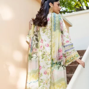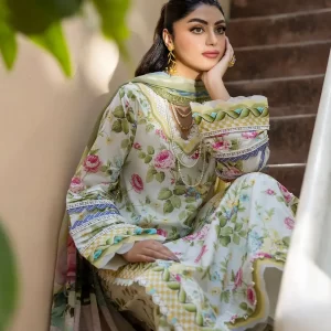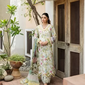 The shirt and trousers are made from premium quality lawn, offering a breathable and lightweight experience, ideal for warm weather. Completing the set is a delicately crafted chiffon dupatta that adds a touch of luxury and fluid grace to the outfit.