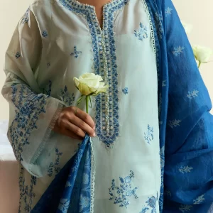 Cool, crisp, and effortlessly graceful—the Fresh Aqua Embroidered Lawn Suit is your perfect summer essential. Designed in soothing aqua tones, the outfit features elegant embroidery across the center and side panels, with intricate detailing continuing on the sleeves and back.