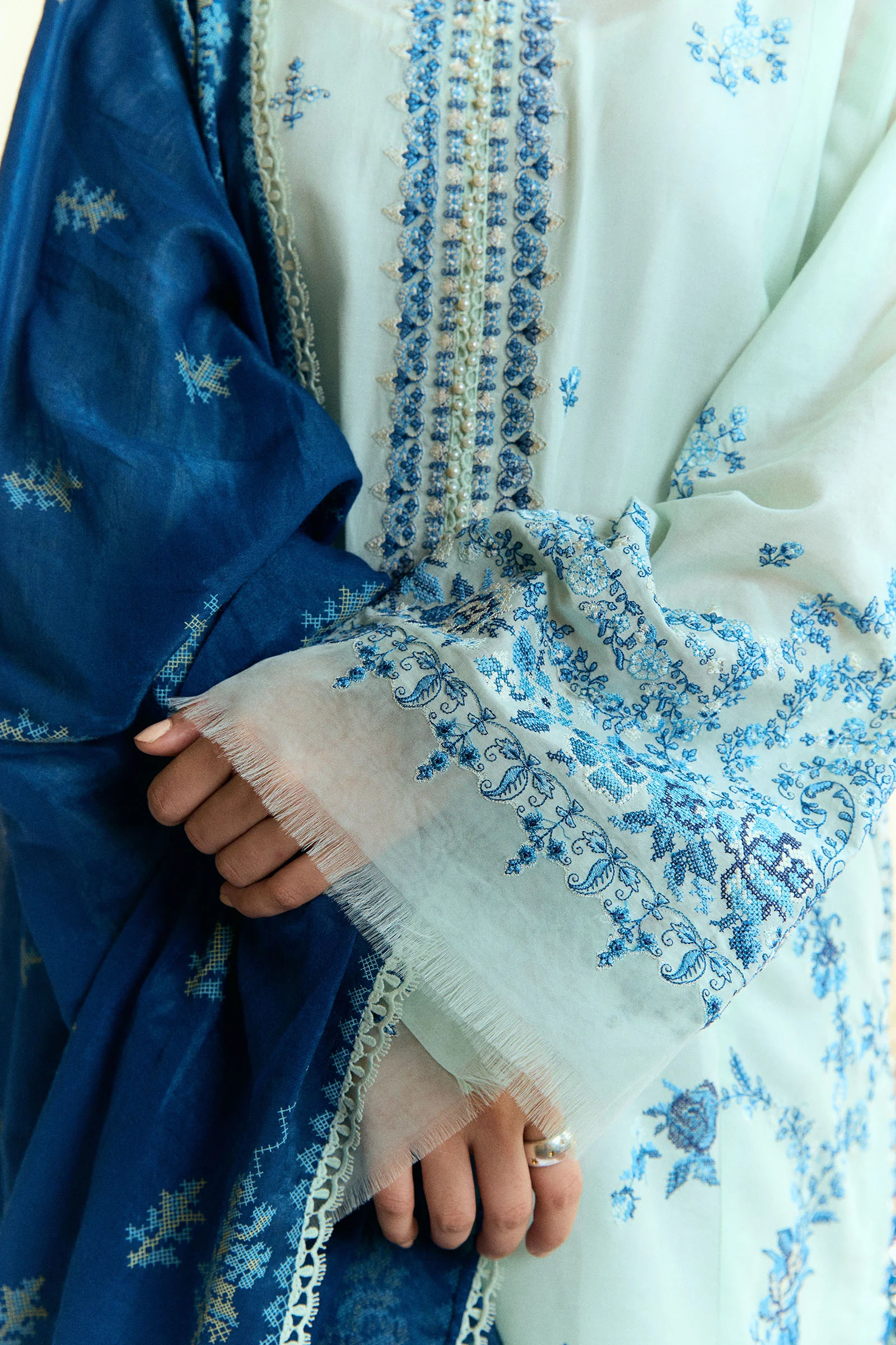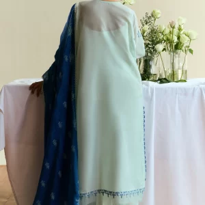 A beautifully embroidered organza neck patch adds a subtle layer of refinement, creating a polished and well-balanced look. The cambric trouser brings comfort and coordination, while the navy cotton silk dupatta steals the spotlight with its bold contrast and artistic flatbed print—offering movement, texture, and charm.