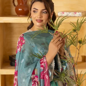 Tranquil Aqua Marine Printed Lawn Suit with Embroidered Details and Chiffon Dupatta