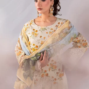 Dupatta: Printed Monarch Silk – Smooth and lustrous, featuring elegant prints on a luxurious silk base for a graceful, flowing silhouette.