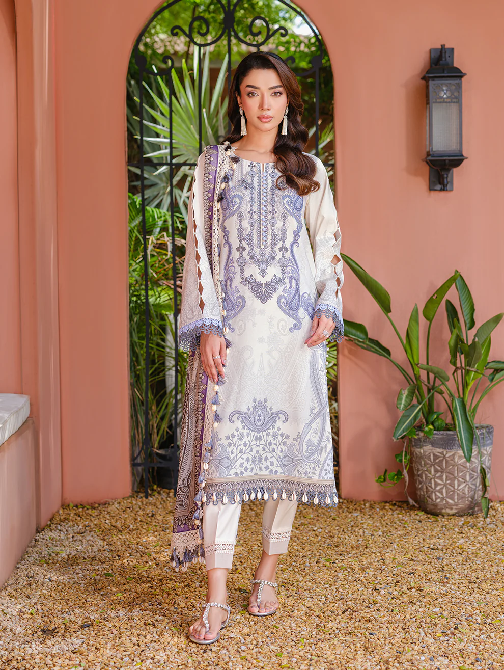 Elegant White Embroidered Cotton Suit with Floral Silk Dupatta