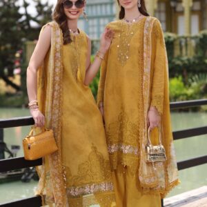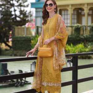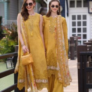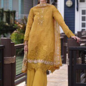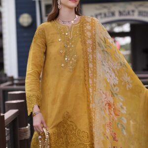 Made for sunlit celebrations and carefree summer days, this mustard yellow 3-piece unstitched lawn suit is a joyful expression of color and craft. The digitally printed shirt bursts with energy, featuring playful patterns on the front, back, and sleeves. The design is elevated with panni embroidered detailing at the neckline, adding a soft shimmer of festive charm.