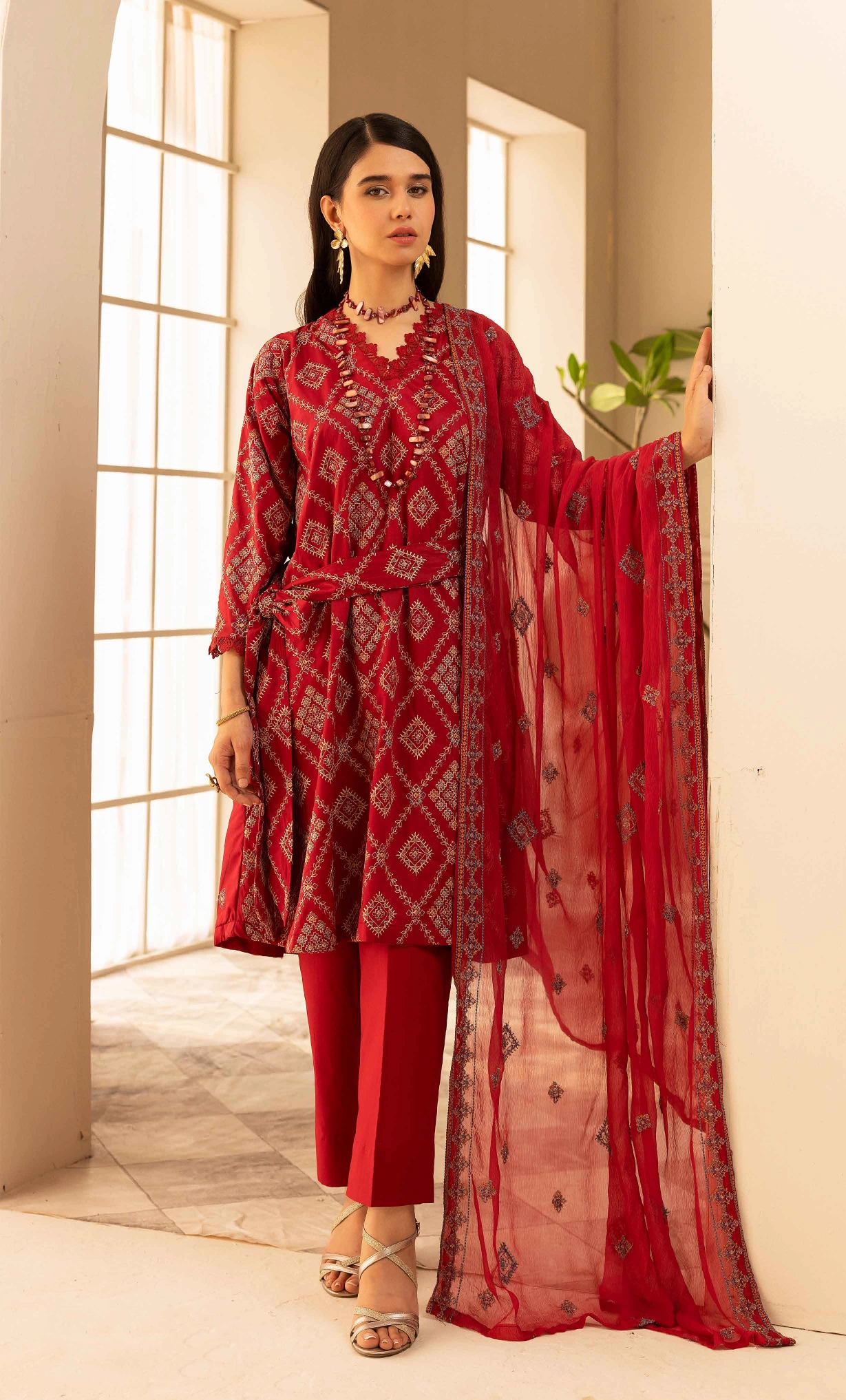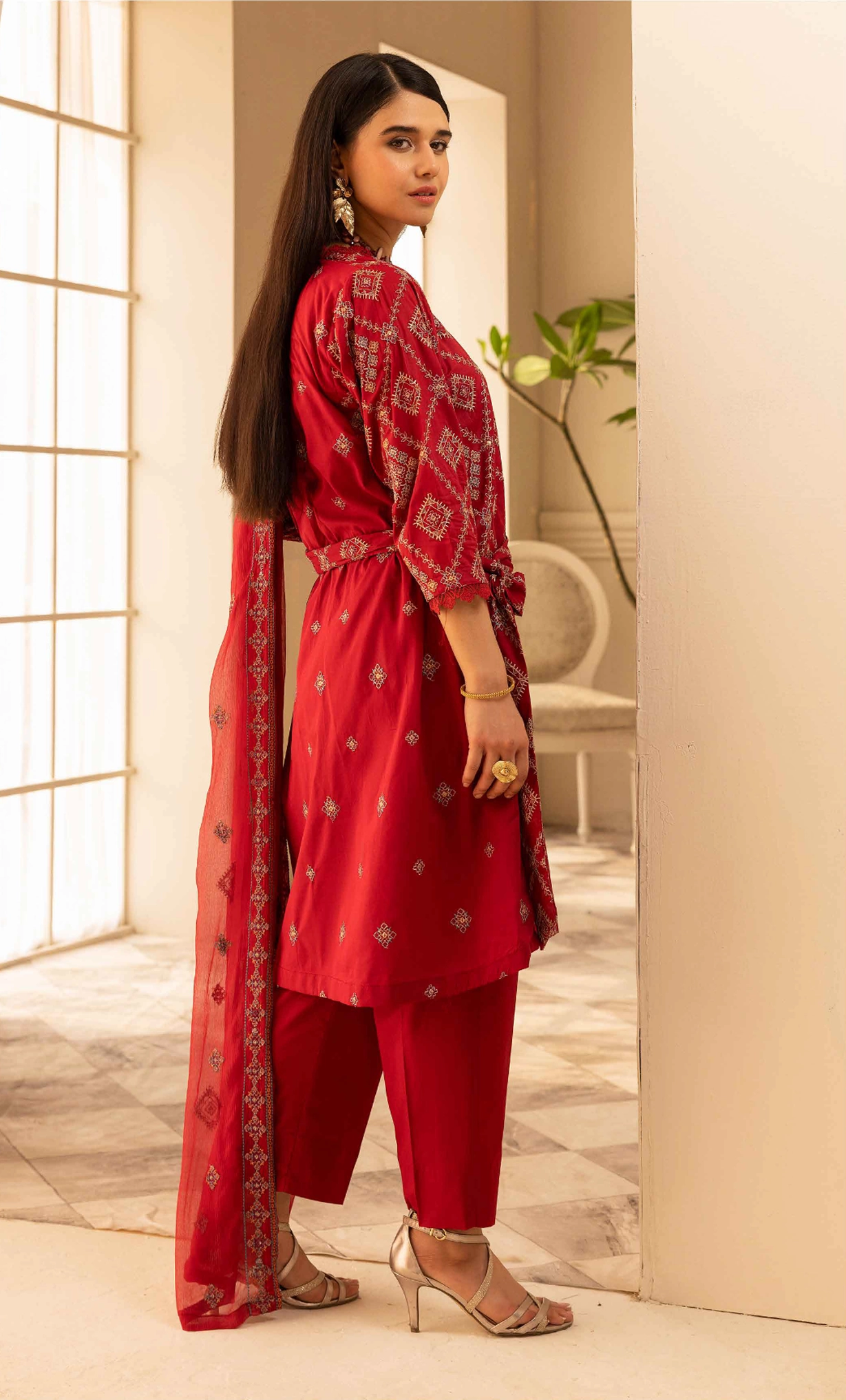 Striking Red Embroidered Cotton Suit with Printed Silk Dupatta