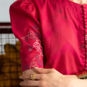 A hot pink ensemble with Bandhani-inspired detailing, paired with a breezy chiffon dupatta—vibrant, playful, and rooted in tradition.