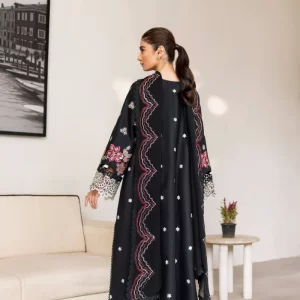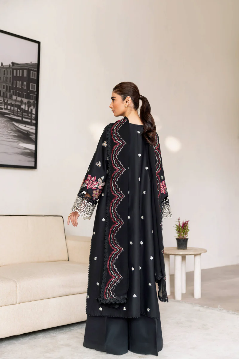 Striking Black Embroidered Cotton Ensemble with Silk Dupatta