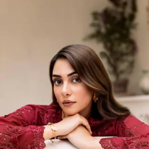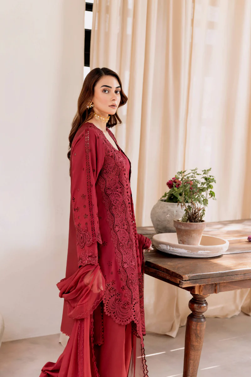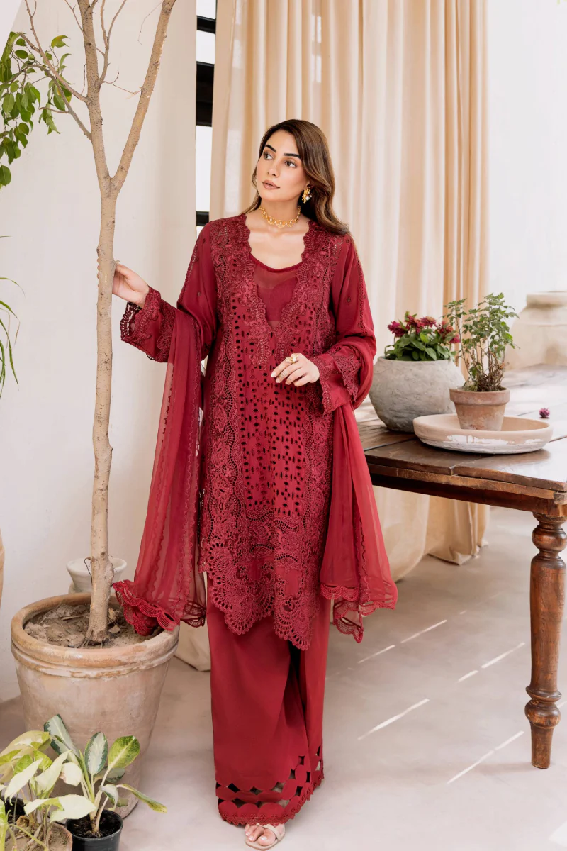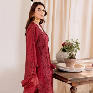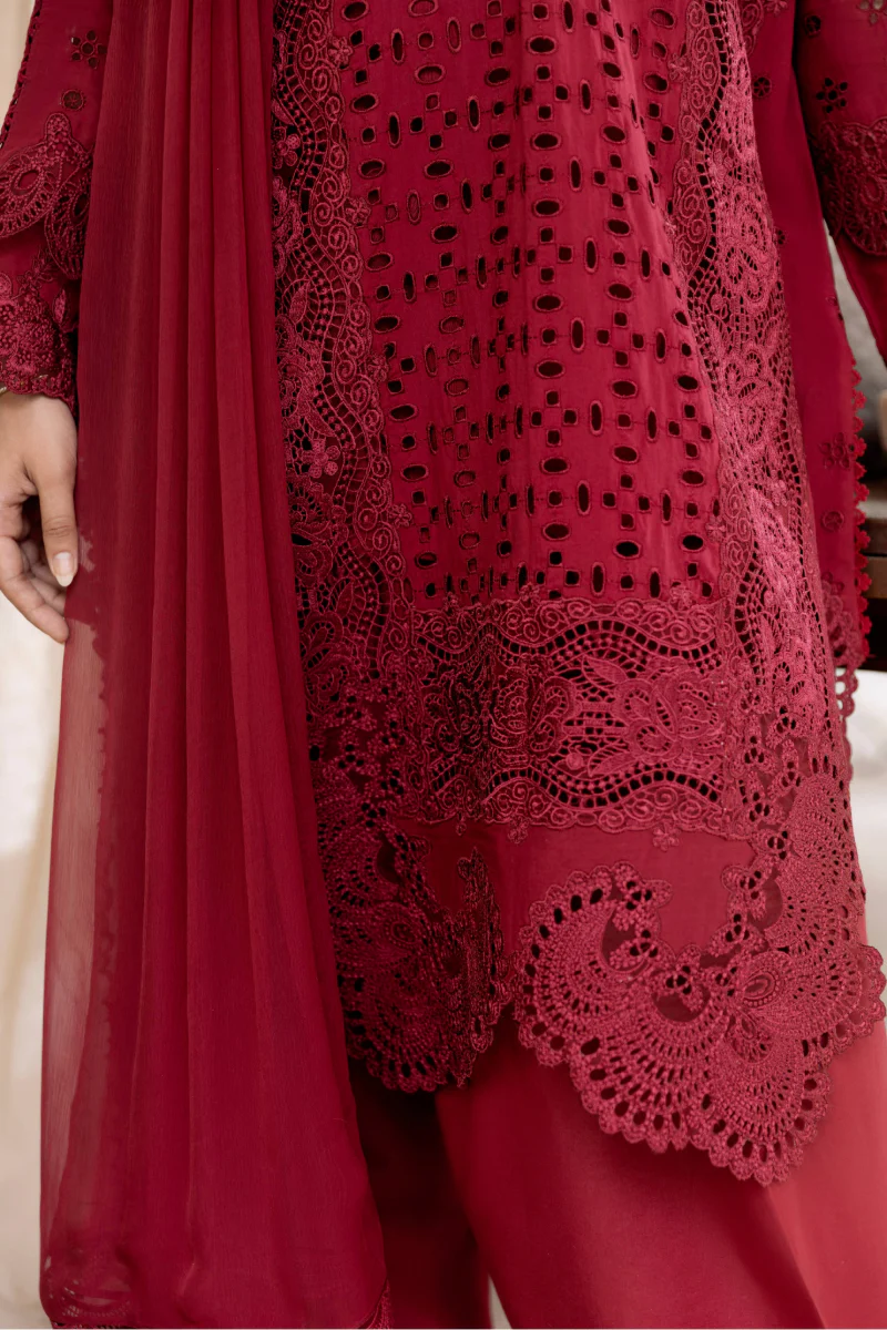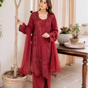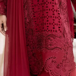 Luxurious Mulberry Red Embroidered Lawn Suit with Chiffon Dupatta