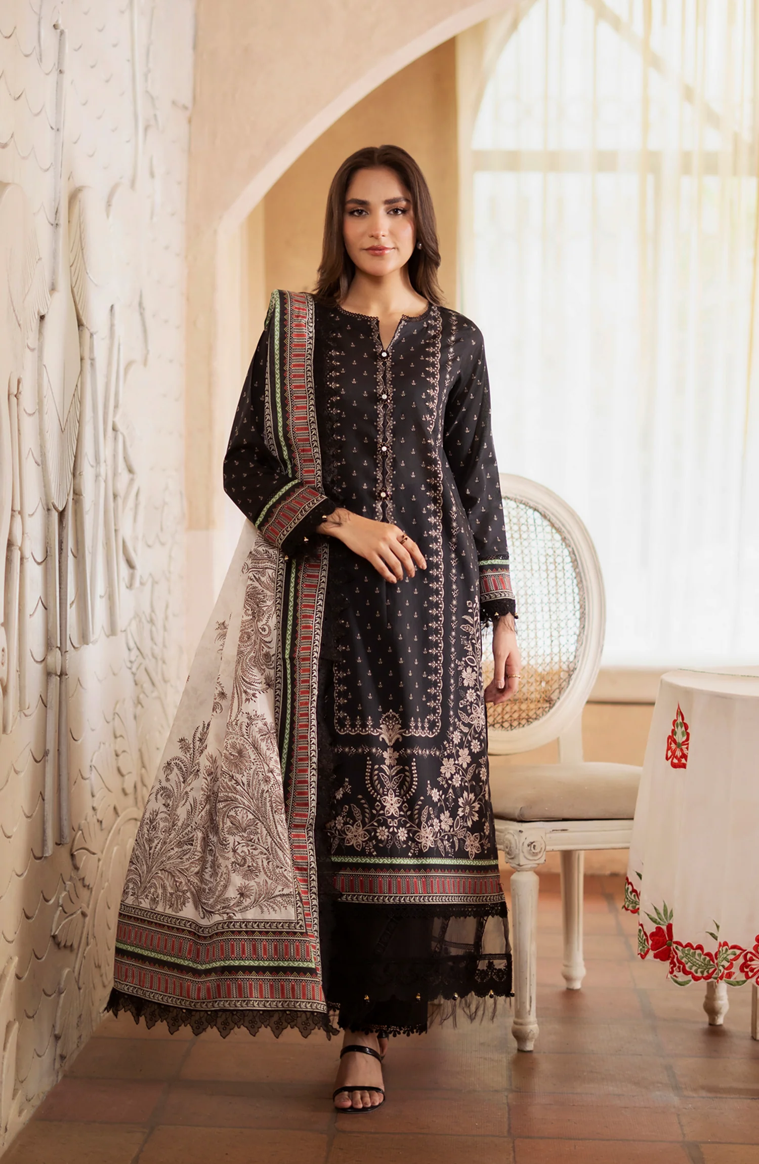 Striking Red Embroidered Cotton Suit with Printed Silk Dupatta