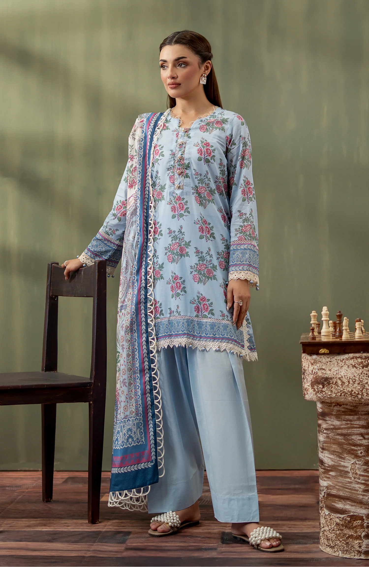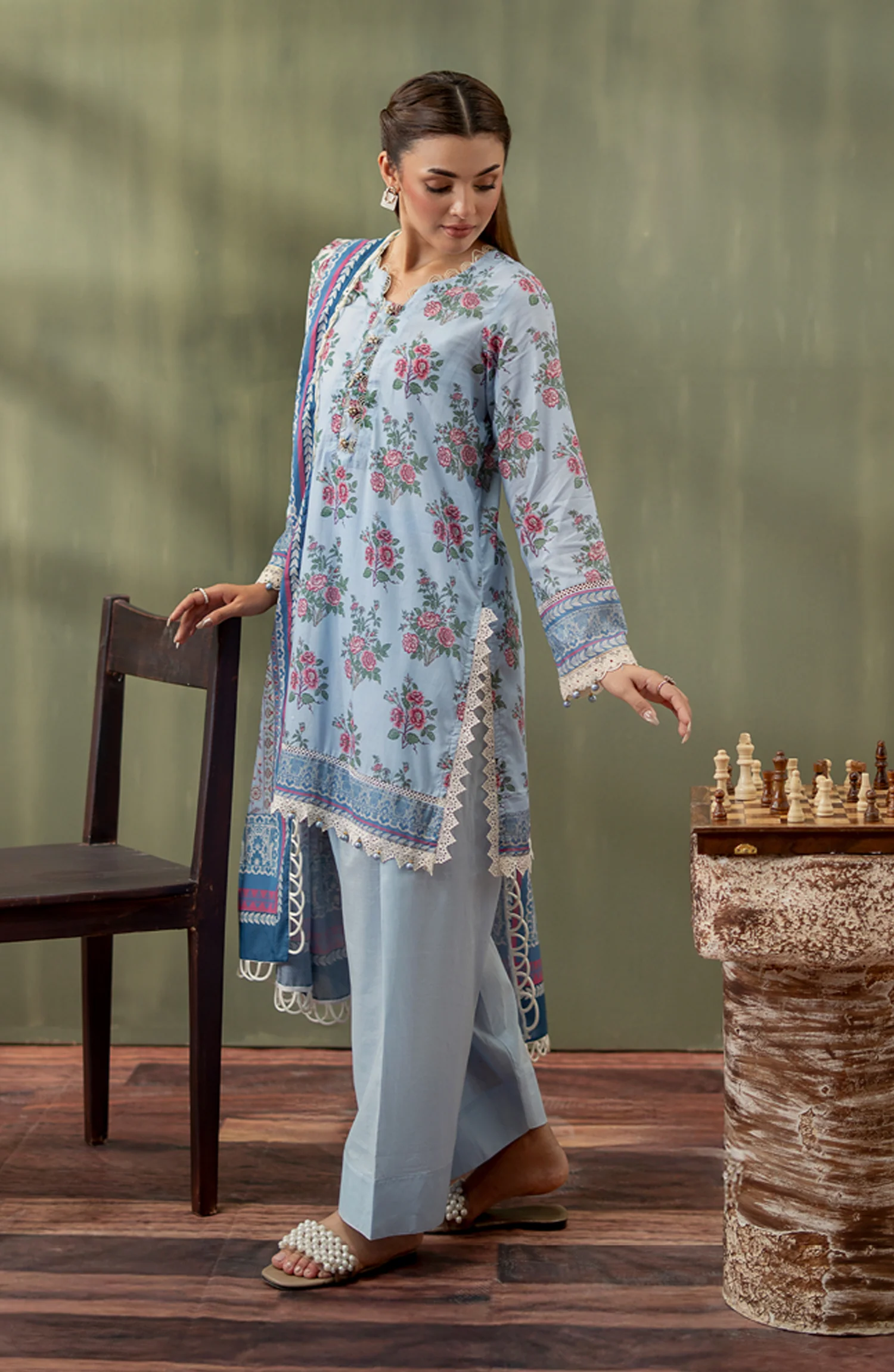 Serene Cerulean Blue Embroidered Lawn Suit with Chiffon Dupatta