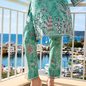 Milena in Turquoise Green from our Spring Printkari ’25 Collection. A printed cutwork embroidered cotton 3-piece outfit paired with digital printed chiffon dupatta.