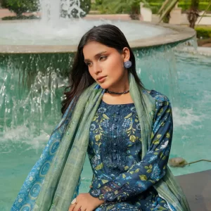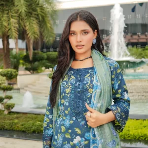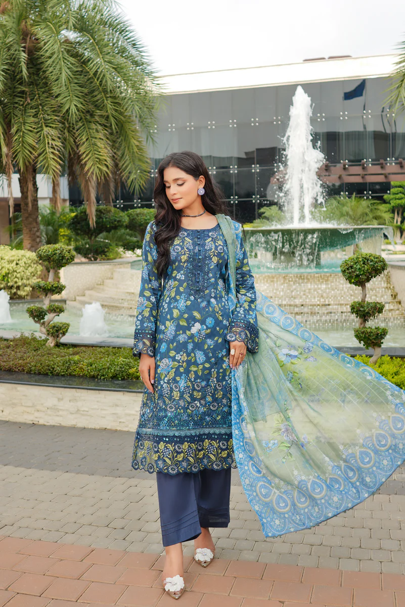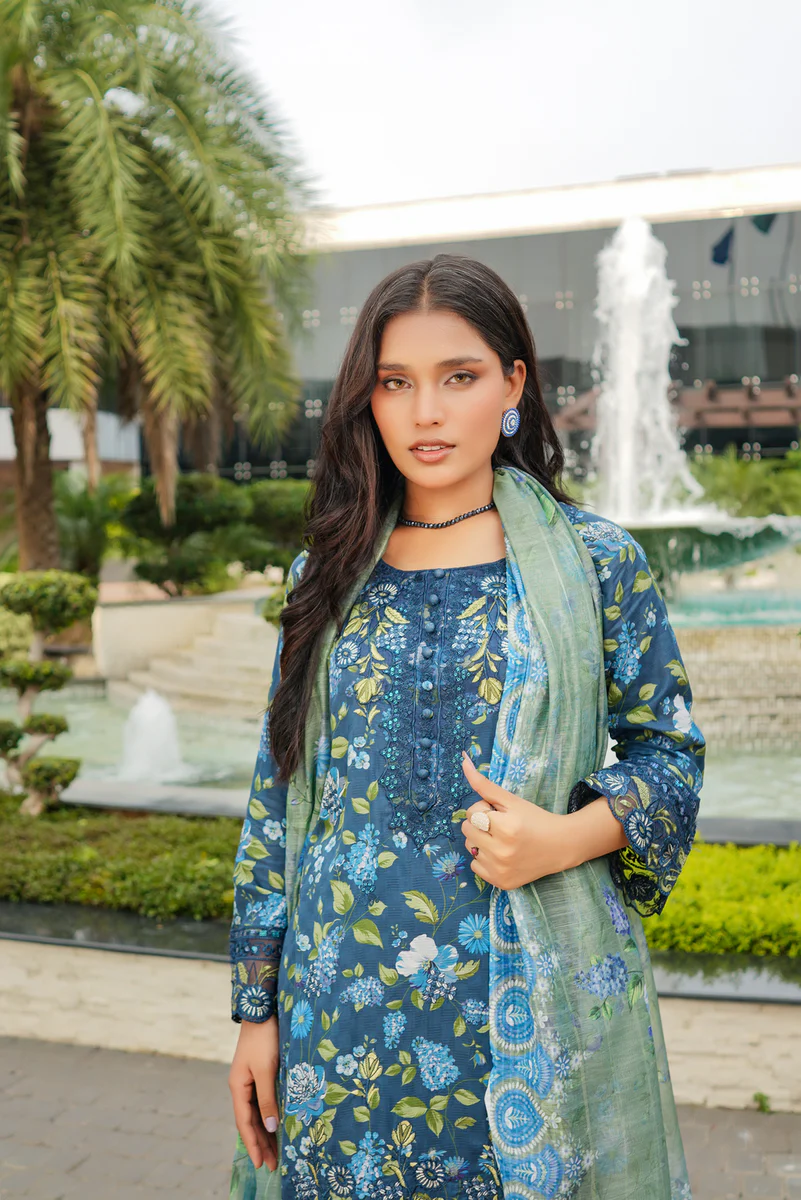 Tranquil Aqua Marine Printed Lawn Suit with Embroidered Details and Chiffon Dupatta