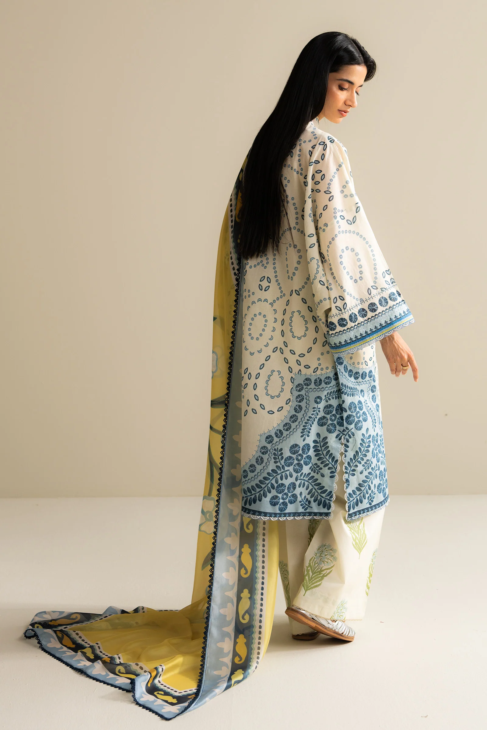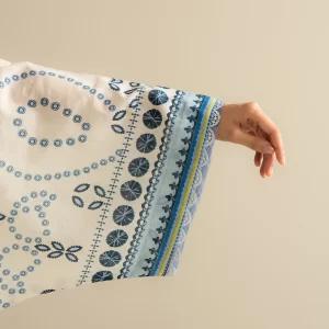 A blue-on-ivory shirt with ivory trouser, paired with a flowing silk dupatta—light, balanced, and made for summer.