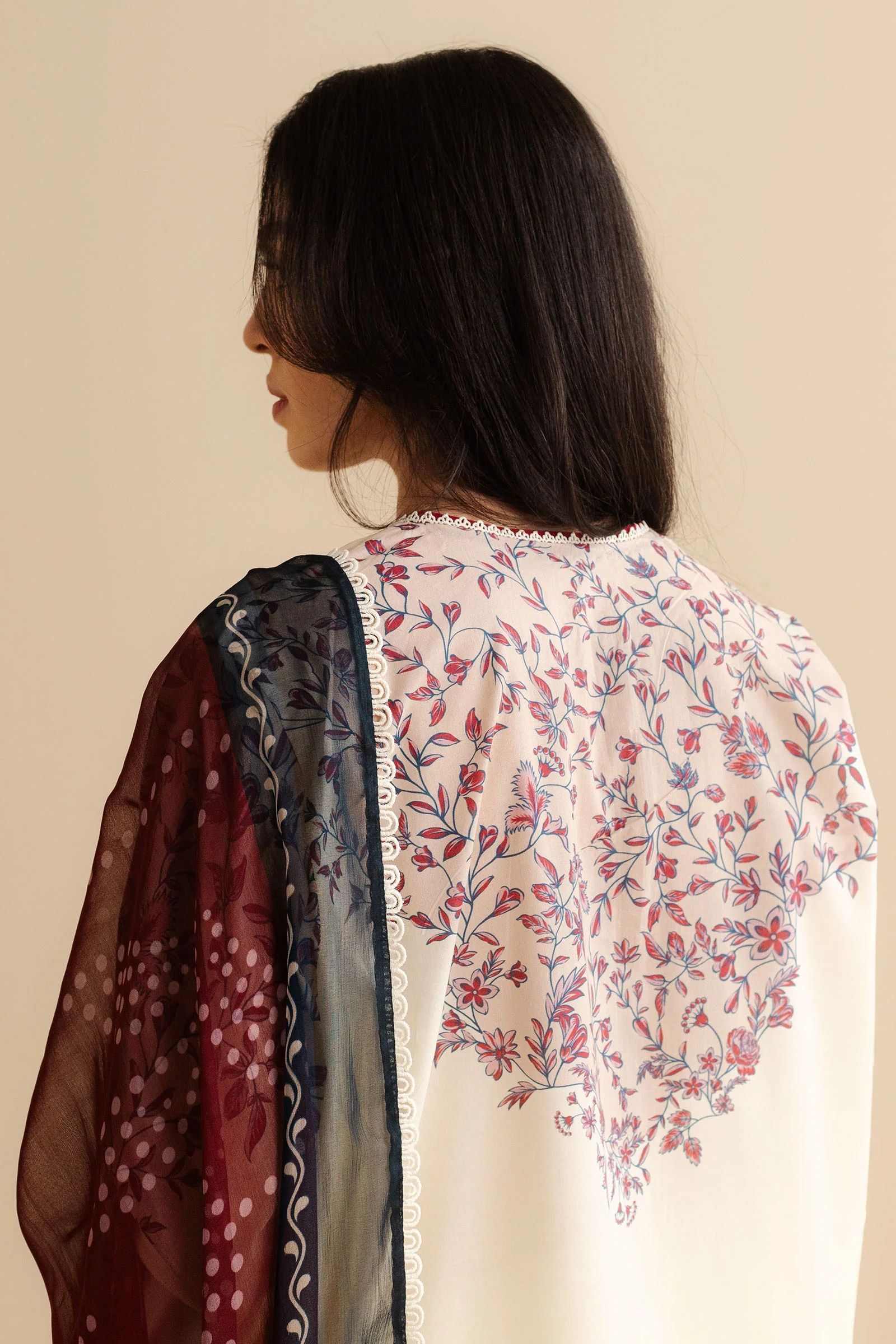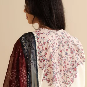 Elegant White Embroidered Cotton Suit with Floral Silk Dupatta