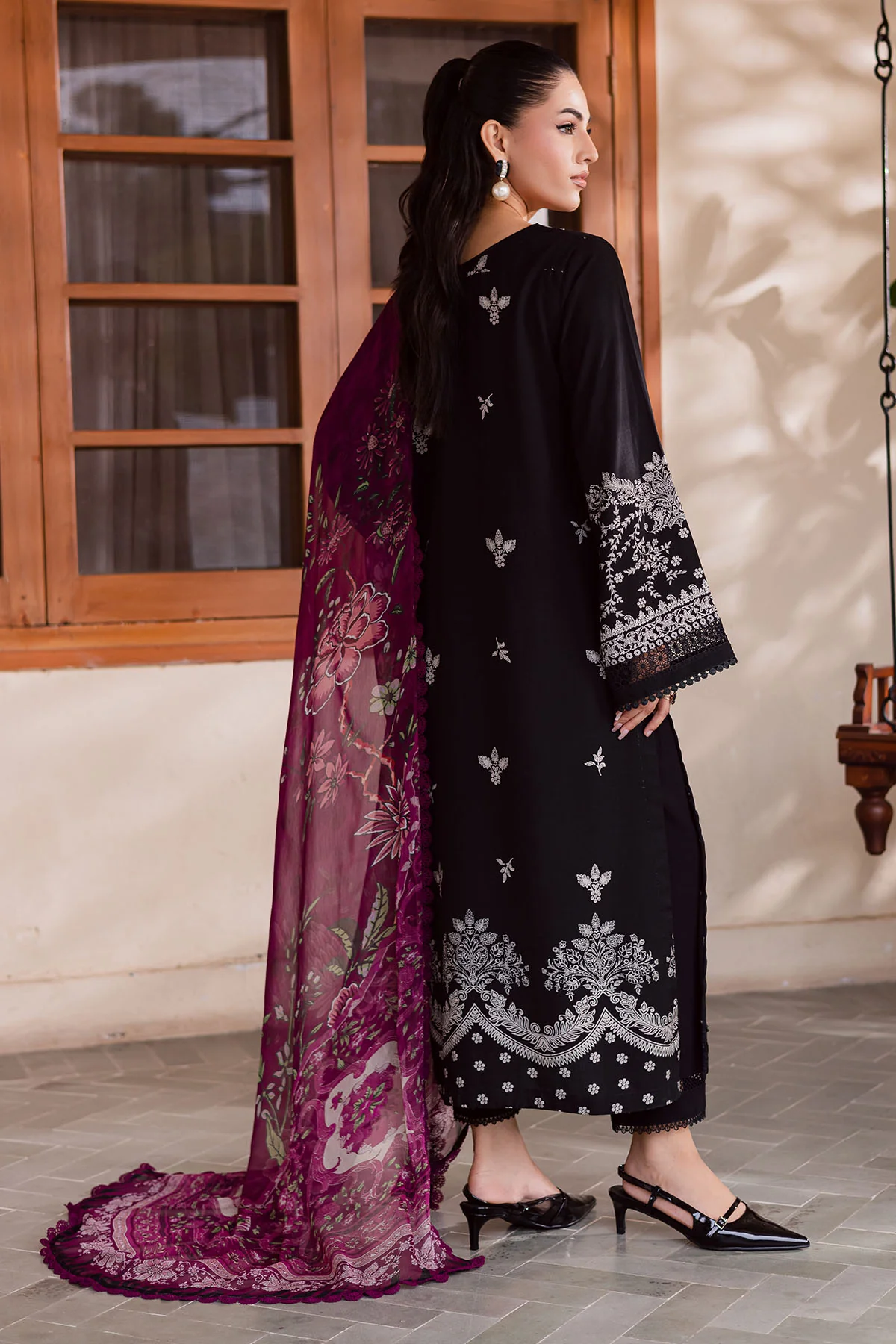 Elegant White Embroidered Cotton Suit with Floral Silk Dupatta