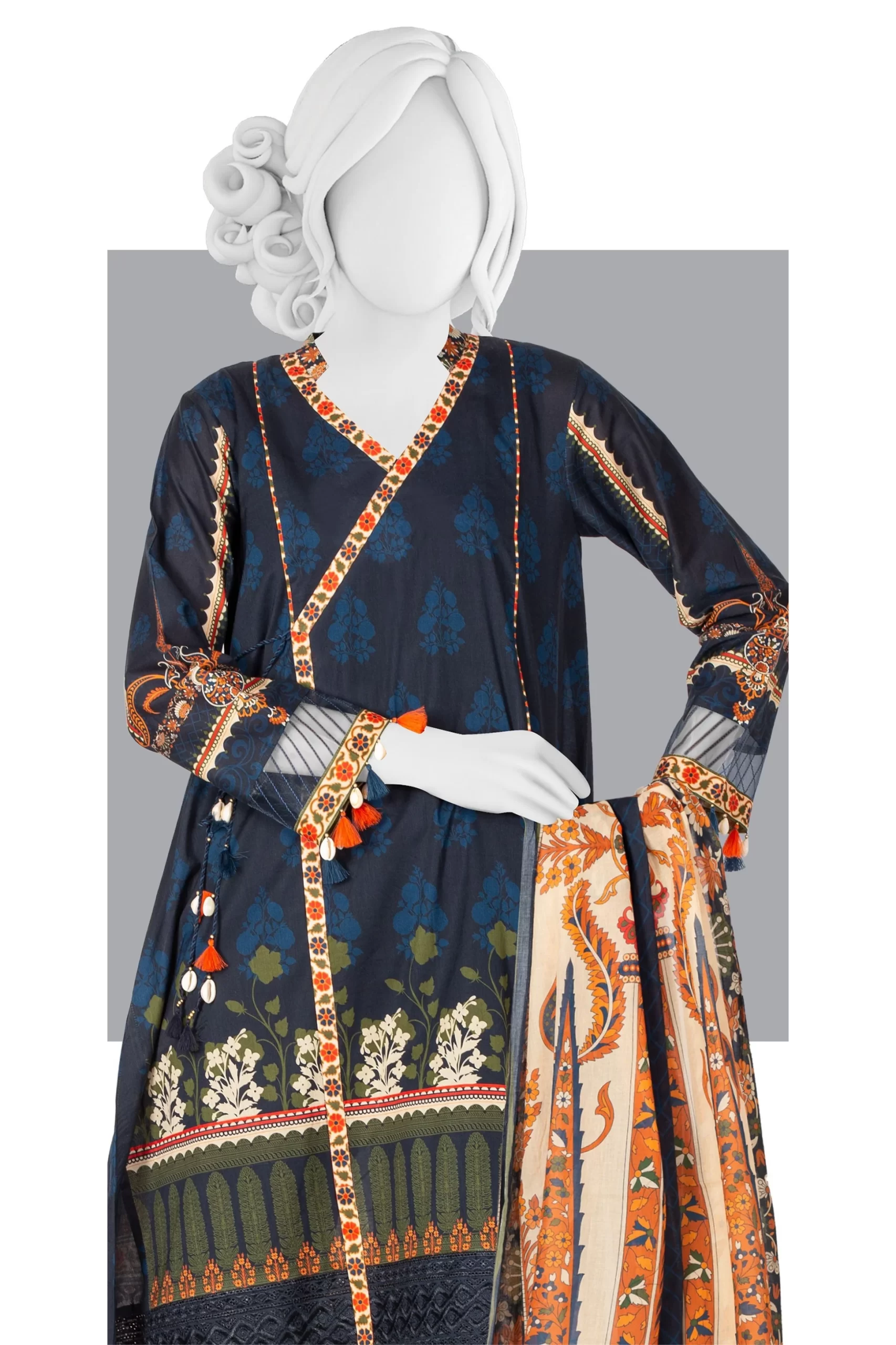 Elegant Navy Blue Embroidered Lawn Suit with Printed Chiffon Dupatta