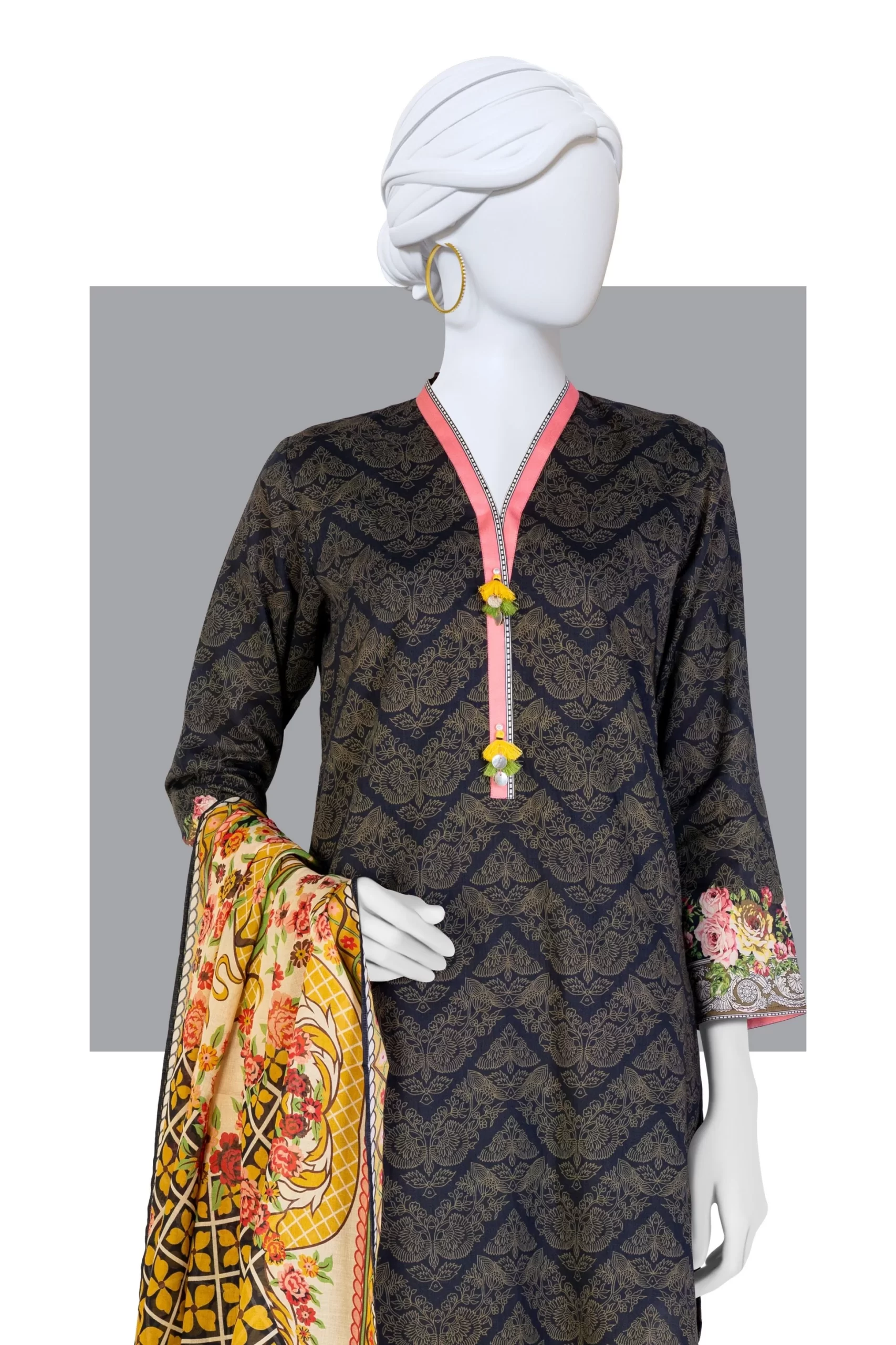 Elegant Navy Blue Embroidered Lawn Suit with Printed Chiffon Dupatta