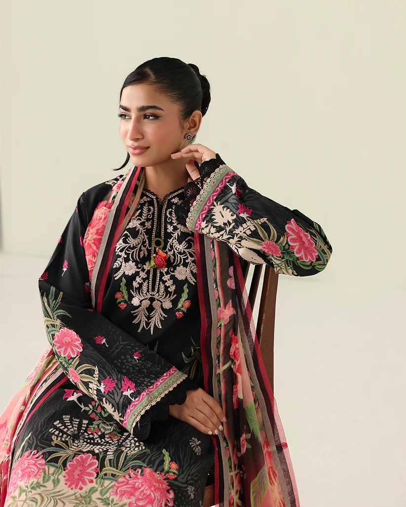 Striking Black Embroidered Cotton Ensemble with Silk Dupatta