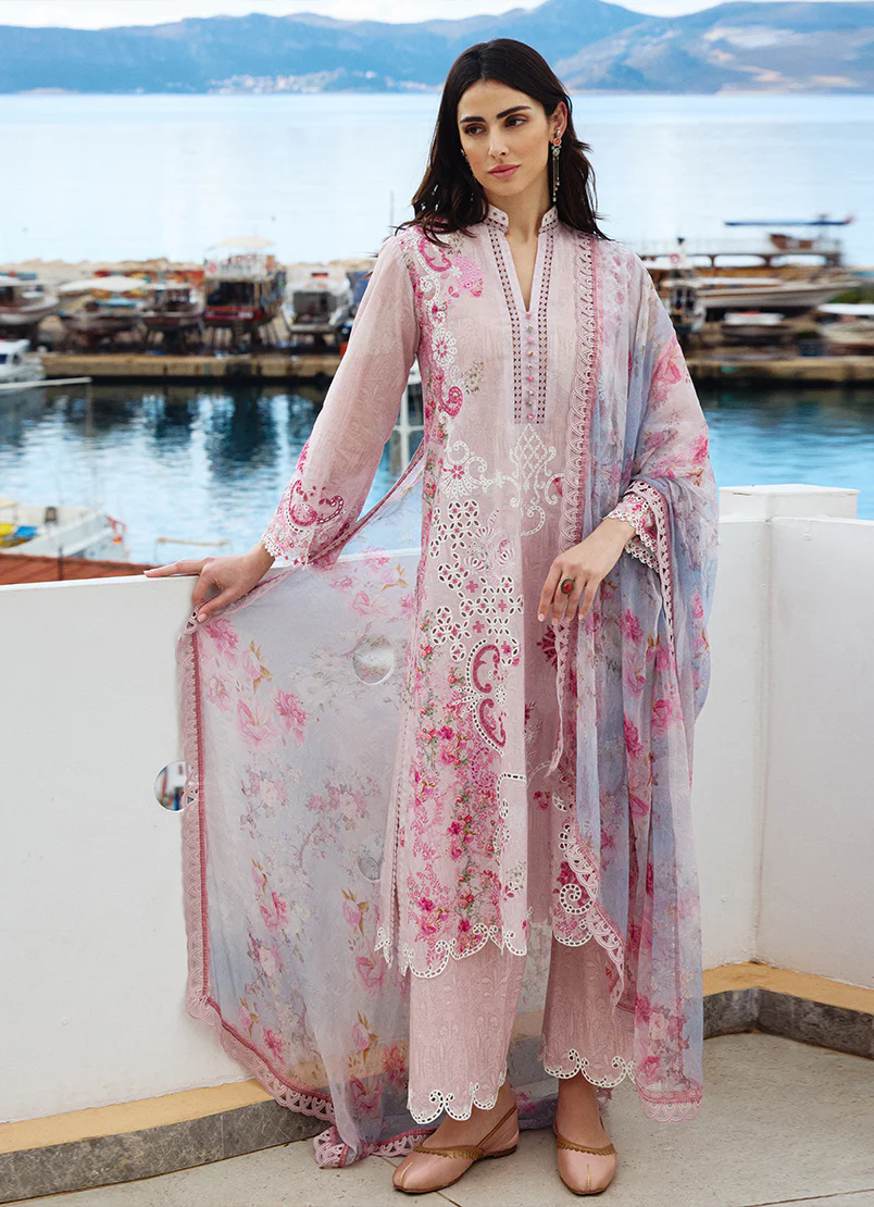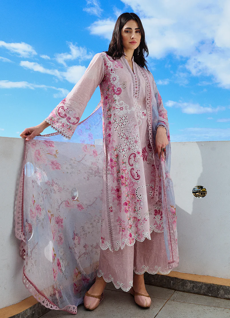Sanem in Pink from our Spring Printkari ’25 Collection. A printed cutwork embroidered cotton 3-piece outfit paired with digital printed chiffon dupatta.
