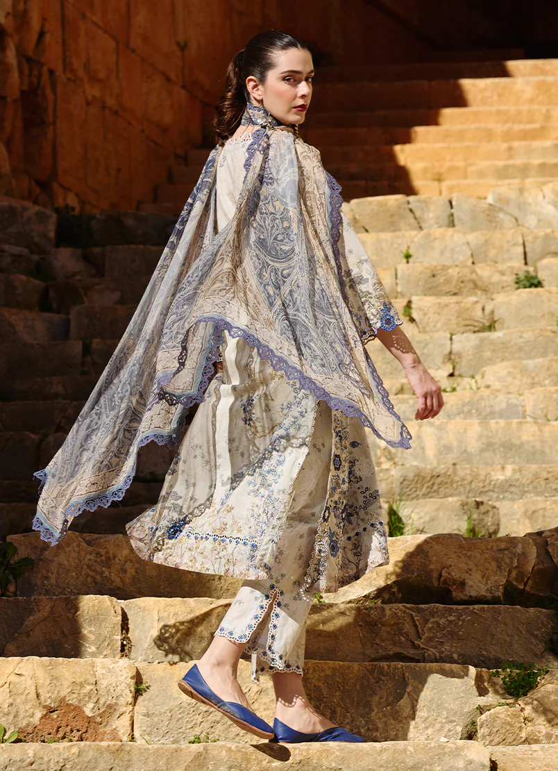 Selina in Ivory from our Spring Printkari ’25 Collection. A printed cutwork embroidered cotton 3-piece outfit paired with digital printed chiffon dupatta.
