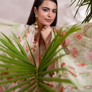 Elegant Beige Printed Lawn Suit with Pink Ombré Chiffon Dupatta
