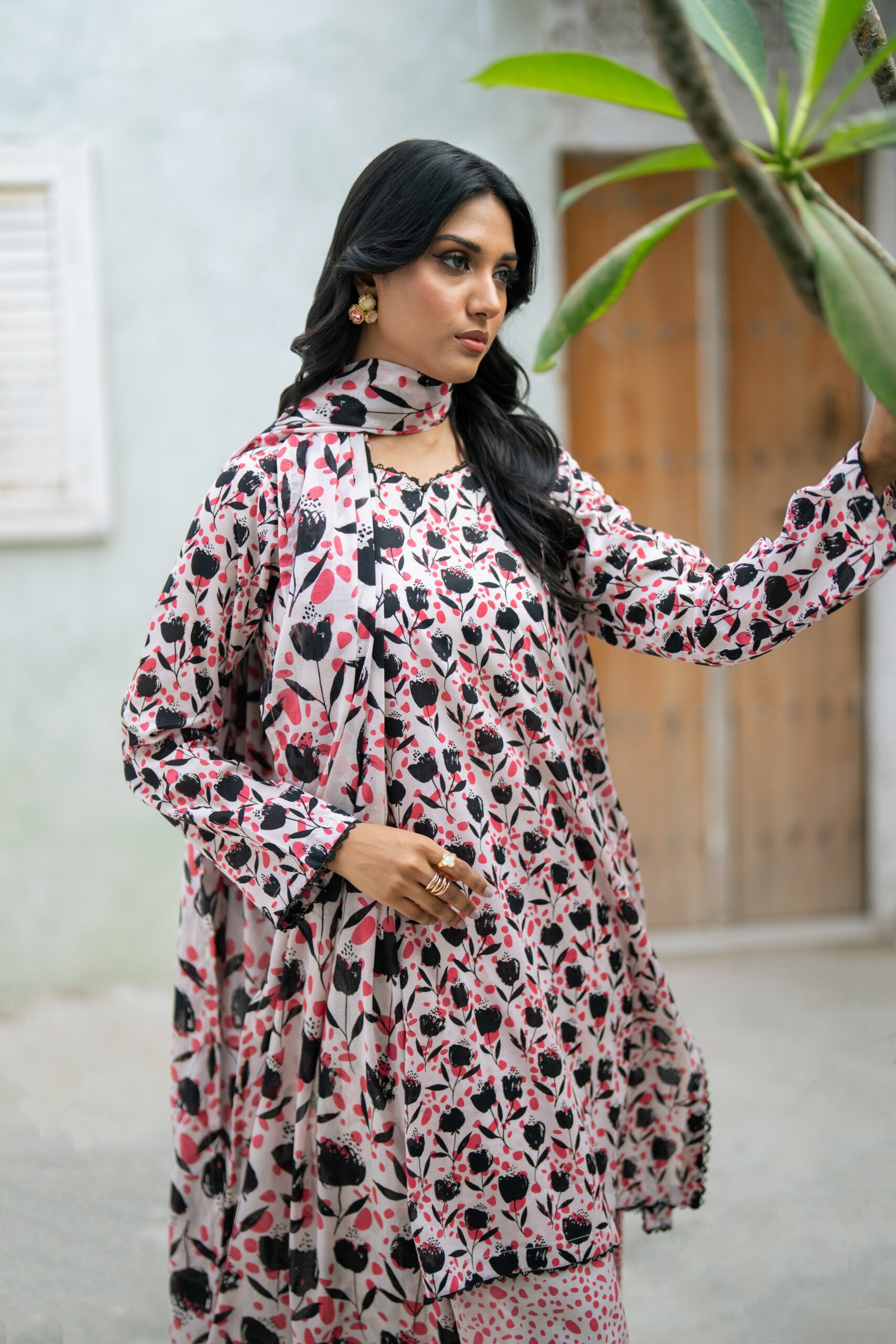 Elegant White Embroidered Cotton Suit with Floral Silk Dupatta