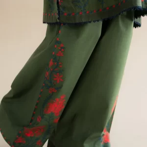 A paisley print shirt in moss green paired with a composed printed trouser, elevated with a graceful silk dupatta—classic with a twist.