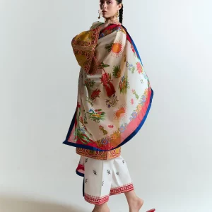 The digitally printed silk dupatta ties the look together with botanical-inspired patterns, bursting in color and movement. Its rich detailing and soft drape enhance the outfit’s expressive character while maintaining a refined traditional flair.