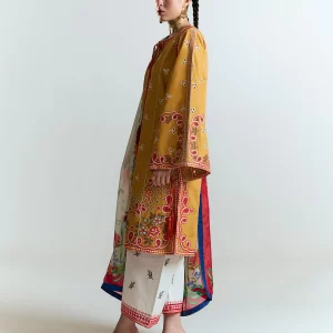 This eye-catching mustard embroidered ensemble is a fresh and vibrant take on traditional wear. The cotton shirt is richly adorned with multicolor floral embroidery, further elevated by digitally printed trims that bring structure and personality to the relaxed silhouette. Wide, embroidered sleeves add a flowing, graceful dimension to the design.