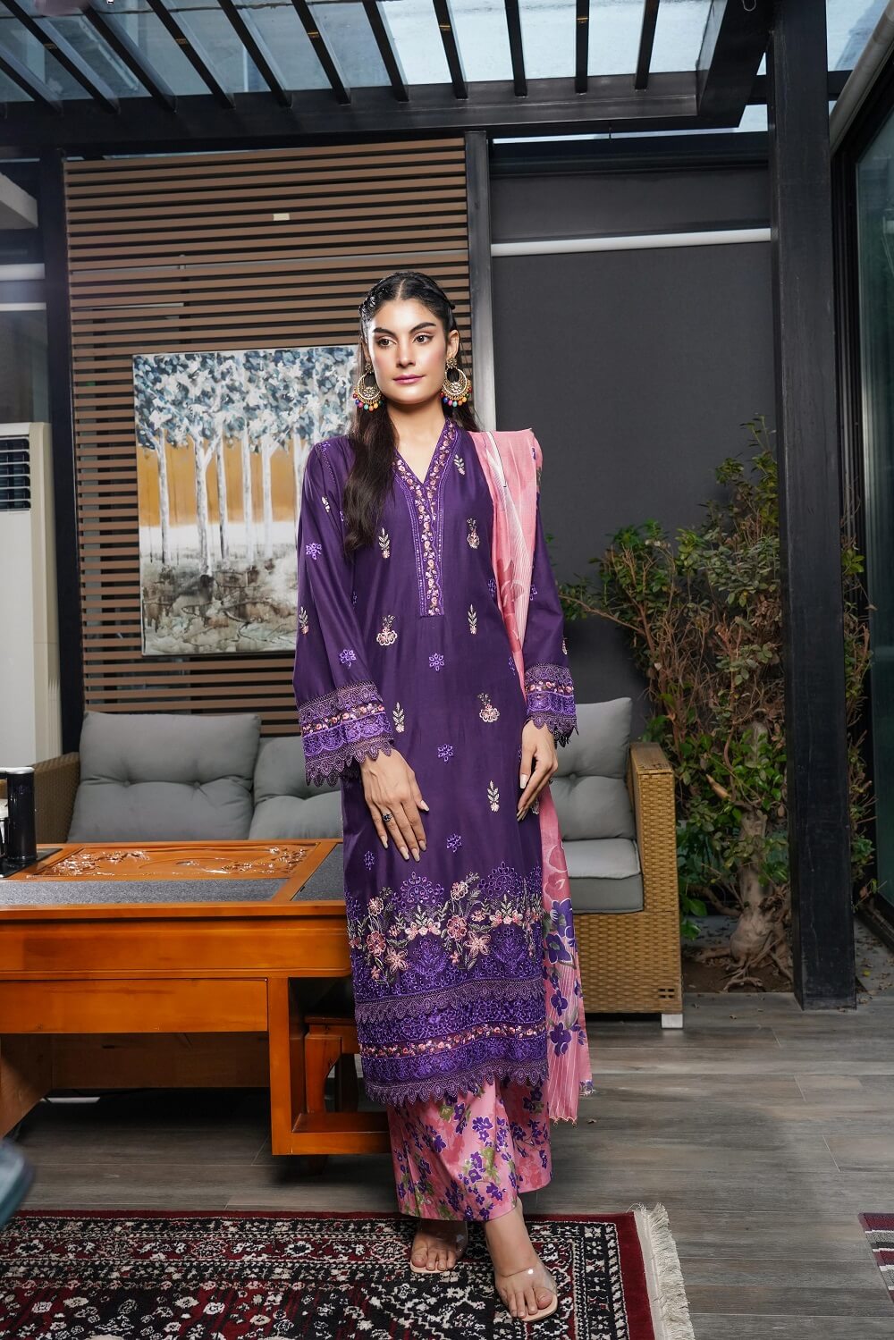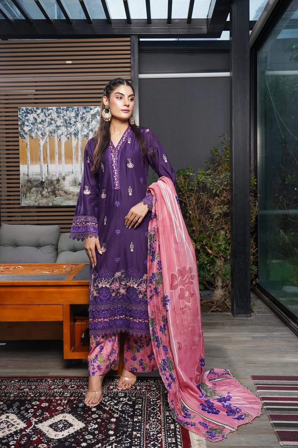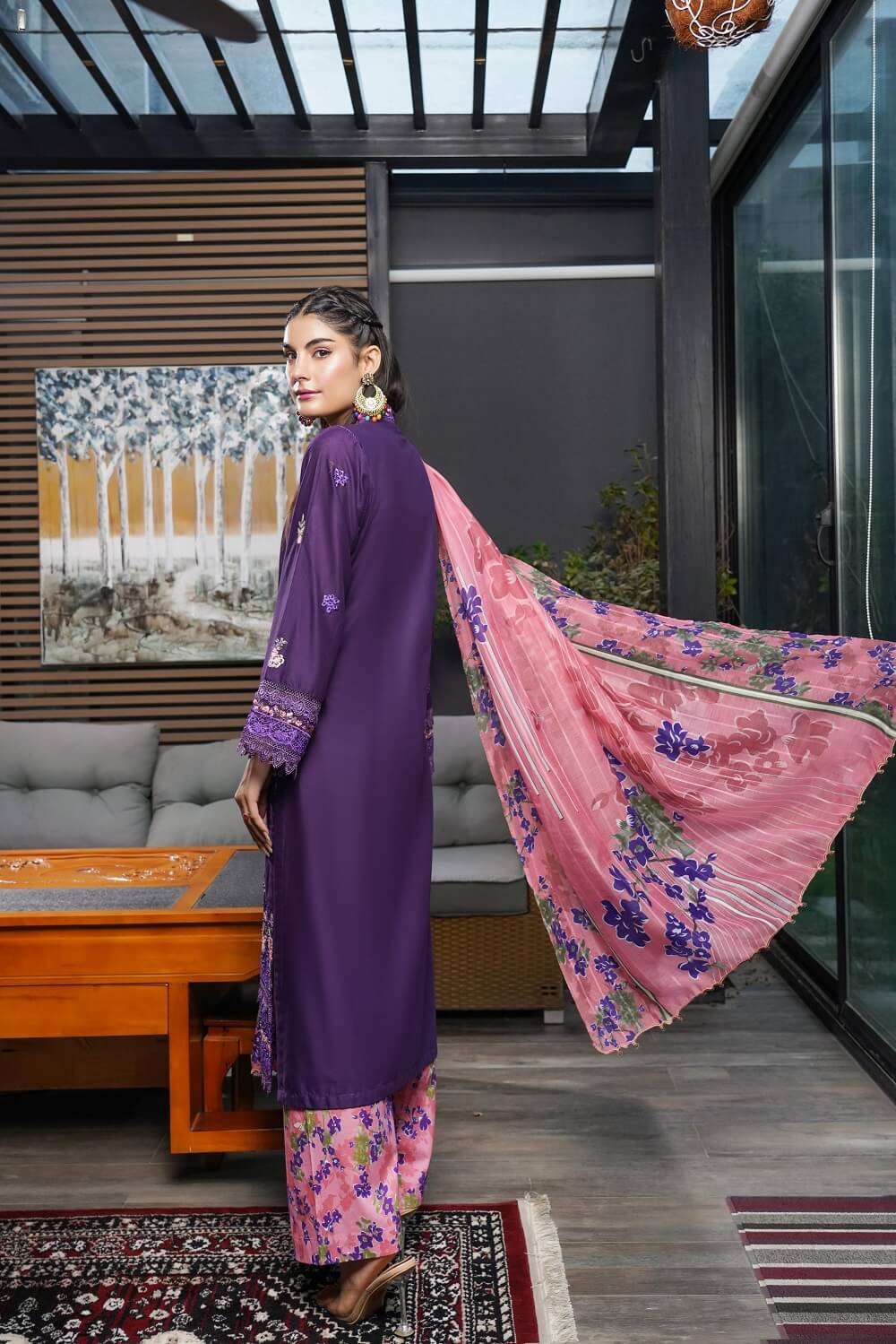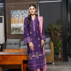 This vibrant magenta outfit is adorned with intricate embroidery on a Pret Airjet base. With detailed borders, a printed trouser, and Munaar dupatta, Zahra reflects grace and sophistication, ideal for festive gatherings and evening wear.