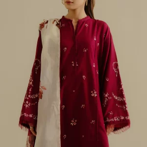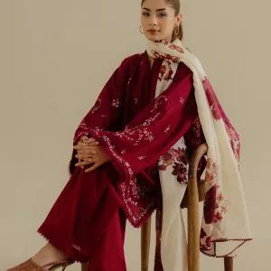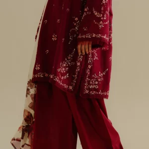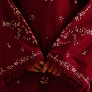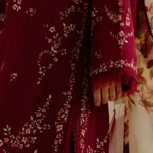 Composed embroidery in rich red monotones laid out over summer lawn, offering depth without noise, finished with a sleek silk dupatta for a balanced, refined finish.