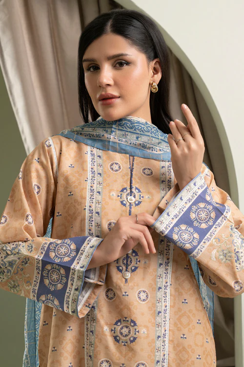 Elegant Beige Printed Lawn Suit with Pink Ombré Chiffon Dupatta