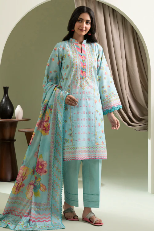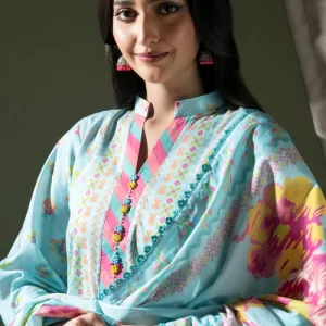 Tranquil Aqua Marine Printed Lawn Suit with Embroidered Details and Chiffon Dupatta