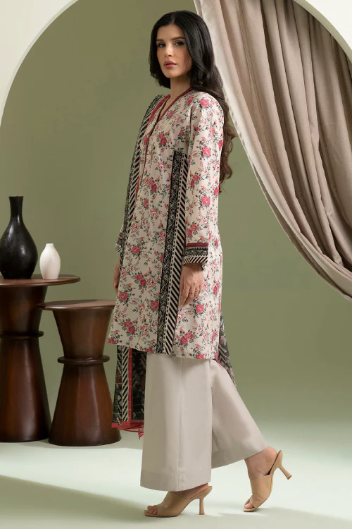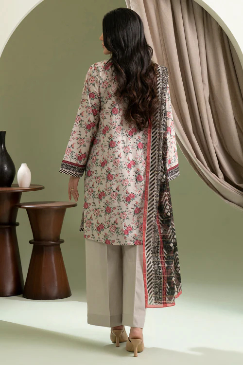 Elegant Beige Printed Lawn Suit with Pink Ombré Chiffon Dupatta